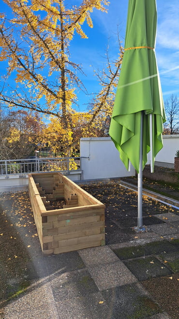 Im Herbst wurden gemeinsam mit einer Klasse noch die Hochbeete auf der Dachterasse aufgebaut und die Gründflächen eingesäht und mit Sedum bepflanzt.